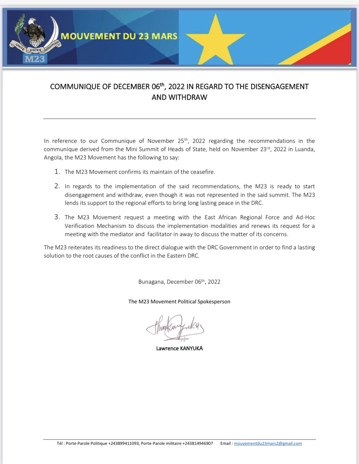 Mu itangazo ryaraye risohowe n’uyu mutwe rigasinnywaho n’Umuvugizi wayo mubya politiki witwa Lawrence Kanyuka, M23 ivuga ko yasanze igomba guhagarika imirwano, ikava mu birindiro yari yarashinze aho yafashe.