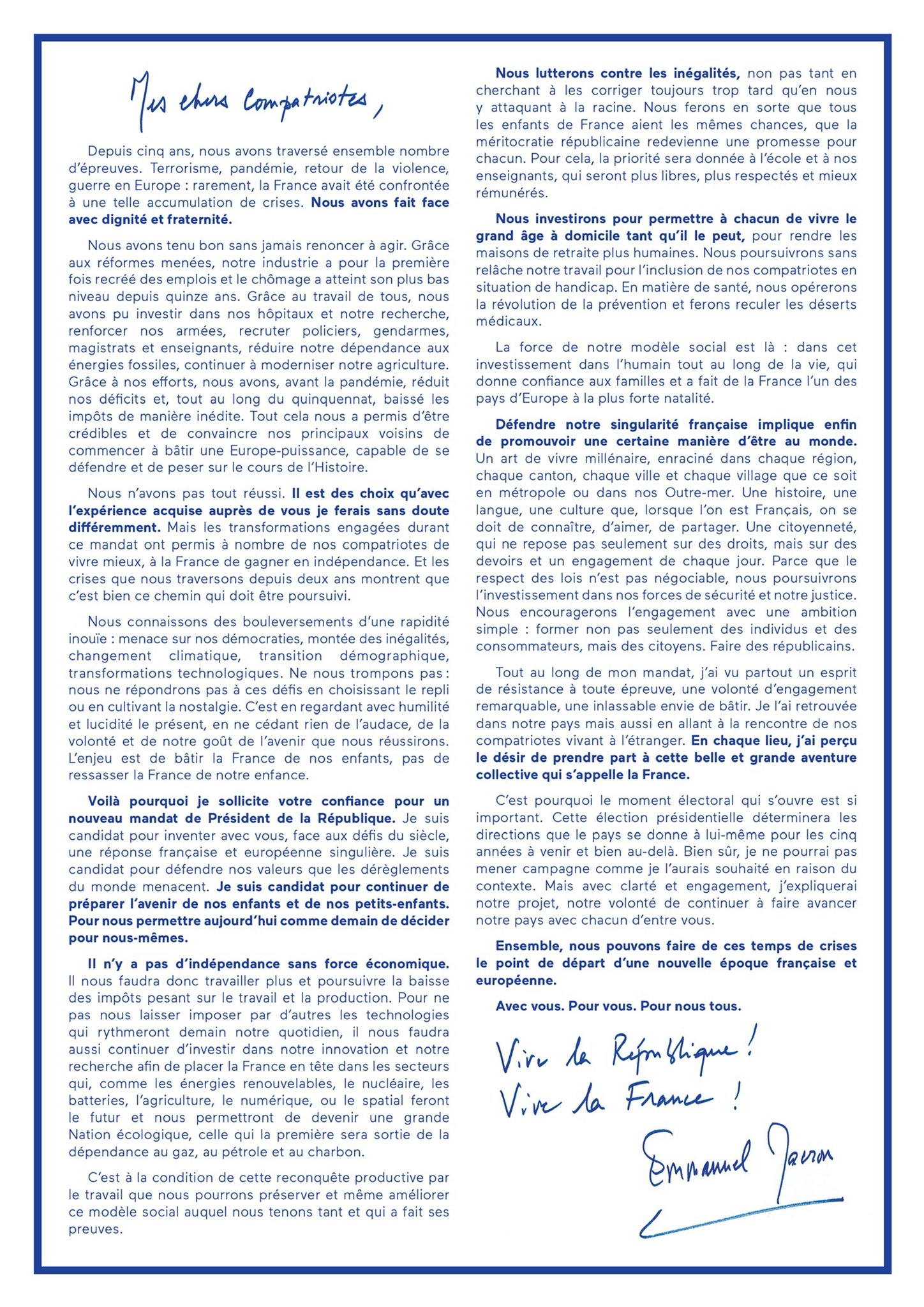 Inyandiko ikubiyemo ubutumwa Perezida w’u Bufaransa Emmanuel Macron yagejeje ku Bafaransa abamenyesha imigambi afitiye igihugu cye nibongera kumutora, yavuze ko icyo ashaka ari uko u Bufaransa buba igihugu cyiyubaka ku nyungu z’abo cyabyaye aho kuba iz’abakuru b’ubu kuko bo bahora biziritse k’ejo, ku byahise.