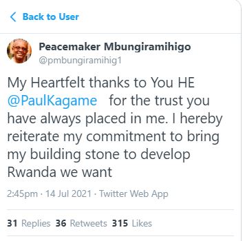 Mbungiramihigo kuri Twitter yavuze ko ashimira n’umutima we wose Umukuru w’igihugu wamuhaye inshingano muri kiriya kigo kandi ko yiyemeje kuzasohoza inshingano zose yahawe kandi neza.