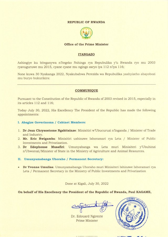 Bikubiye mu itangazo ryashyizweho umukono na Minisitiri w’Intebe Dr Edouard Ngirente.