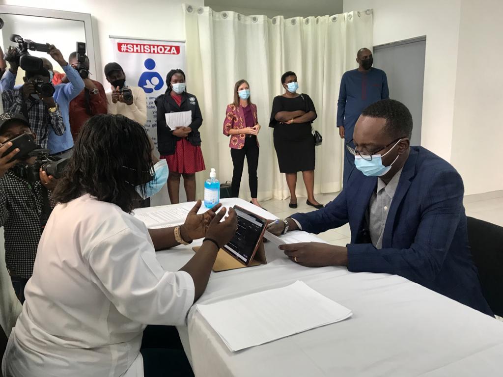 Minisitiri Ngamije yakingiriwe ku Bitaro bya Masaka mu Mujyi wa Kigali, ahatangirijwe iyi gahunda y’ikingira ku rwego rw’igihugu.