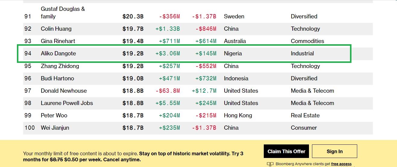 Ku rwego rw’Isi, Aliko Dangote ni umuntu wa 97 ukize kurusha abandi.