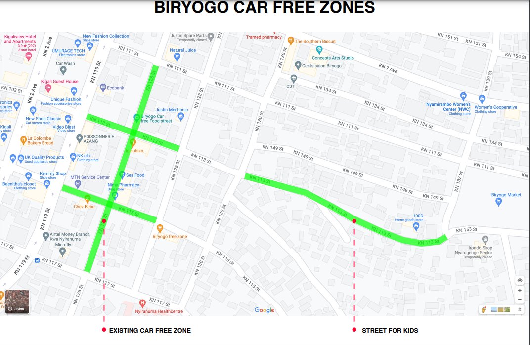 Kuri Twitter Ubuyobozi bw’Umujyi wa Kigali bwanditse buti: “…Umwana NiUmutware: Agace k’umuhanda KN 113 St mu Biryogo, Umujyi wa Kigali wakageneye abana bityo ibinyabiziga bikaba bibujijwe kuhanyura…”