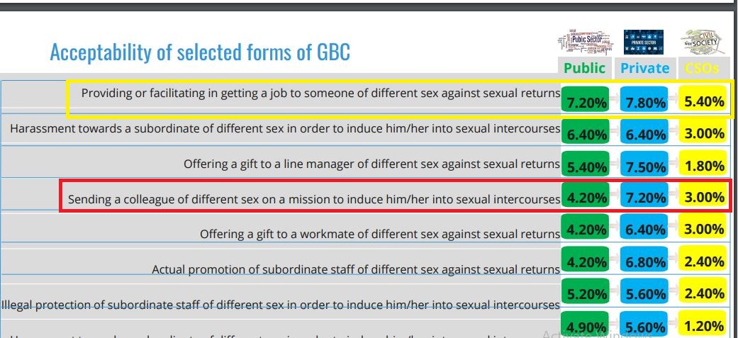 Urugero ni uko abantu bemeye kwakira ruswa y’igitsina mu buryo butaziguye bizezwa akazi usanga mu bikorera ku giti cyabo ari 7.80% mu gihe abo muri nzego za Leta ari 7.20% n’aho muri Sosiyete sivile bakaba 5.40%.