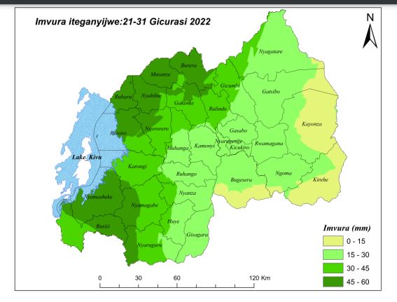 Muri rusange mu Rwanda hateganyijwe imvura iri hagati ya milimetero 0 na 60. Imvura izagabanuka mu gihugu hose. Imvura nyinshi izagwa mu Rwanda izaba iri hagati ya milimetero 45 na 60.