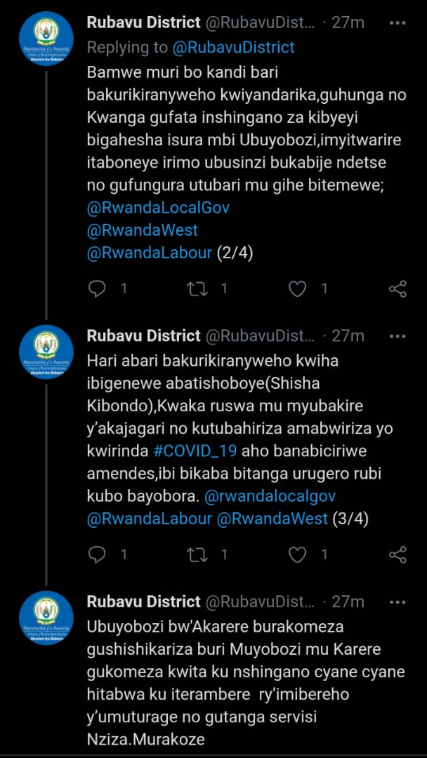 Mu rwego rwo gusobanura uko byagenze, ubuyobozi bw’Akarere bwanditse kuri Twitter ko ibyo bariya banyamabanga nshingwabikorwa bavuga ari amatakirangoyi, ko banditse begura ‘kubera ibyaha bari bamaze iminsi bakora’ birimo no ‘gufungira abaturage mu biro by’Akagari.