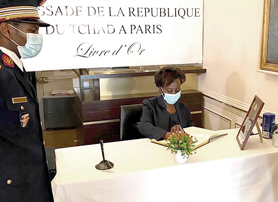 Umunyamabanga mukuru w’Umuryango w’ibihugu bivuga Igifaransa, OIF, Madamu Louise Mushikiwabo yaciye kuri Ambasade ya Tchad i Paris asinya mu gitabo kirimo amagambo yo gusezera kuri Maréchal Idriss Deby Itno.