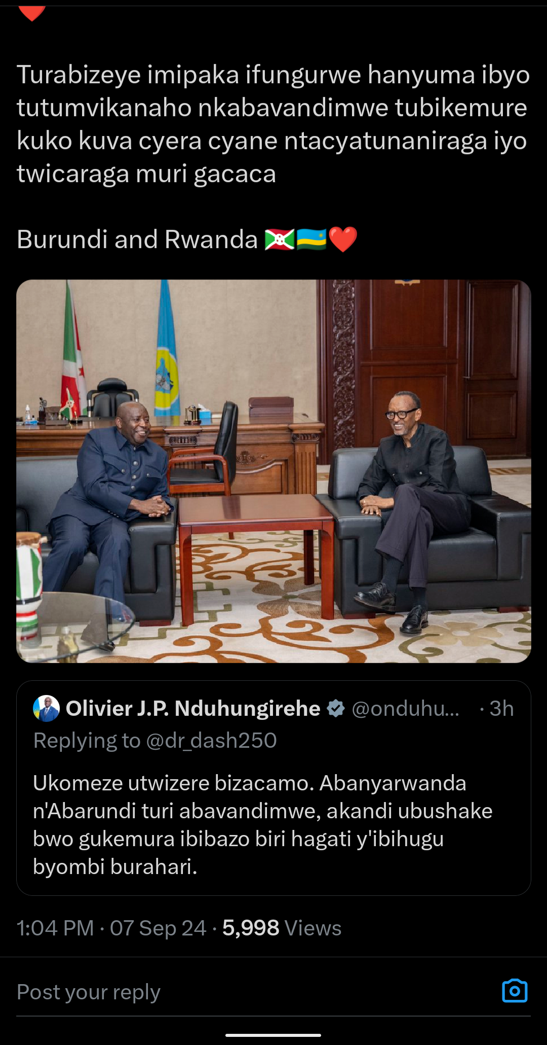 Yanditse ati: “Ukomeze utwizere bizacamo. Abanyarwanda n’Abarundi turi abavandimwe, kandi ubushake bwo gukemura ibibazo biri hagati y’ibihugu byombi burahari.”