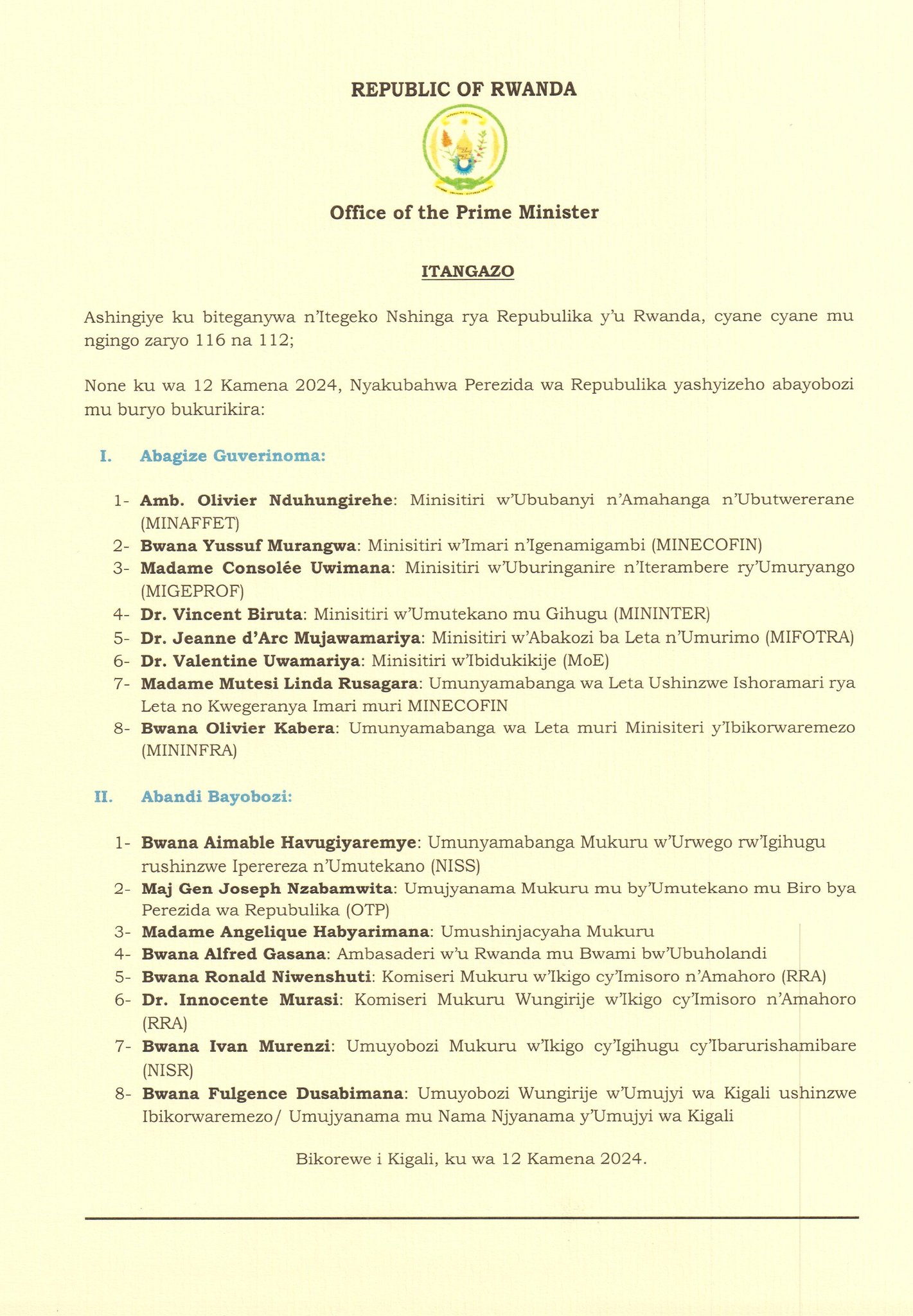 Ni impinduka zikomeye muri Guverinoma y’u Rwanda, igihugu kibura igihe kigera ku kwezi kumwe ngo kijye mu matora y’Umukuru w’igihugu n”ay’Abadepite ateganyijwe muri Nyakanga, 2024.