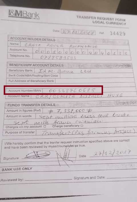Twamenye ko amafaranga kuri iriya compte/account Nbr 00338760685 yitwa iya Croix-Rouge Butare/Huye yagezeyo avuye ku kicaro gikuru cya Croix Rouge.