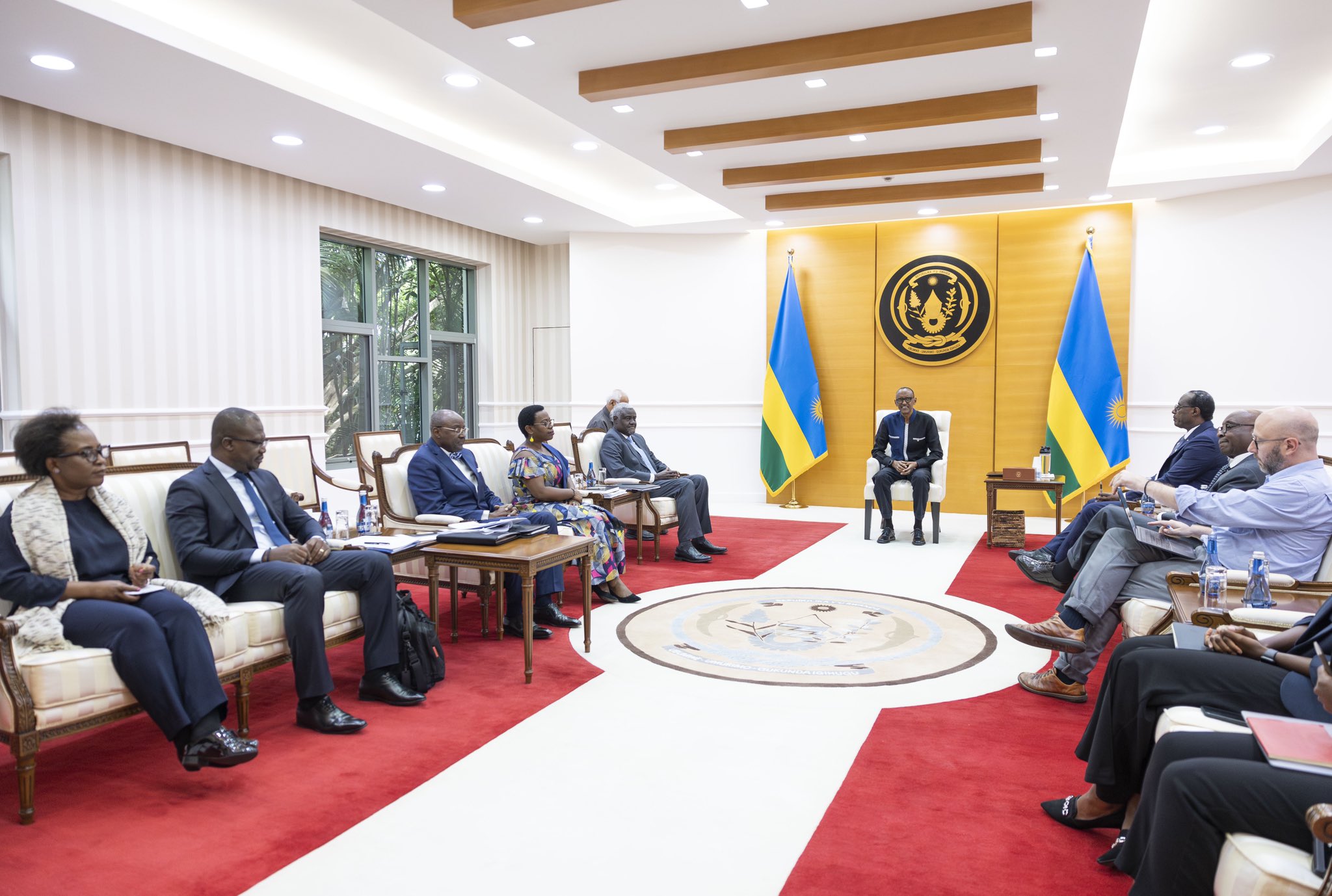 Perezida Paul Kagame yaraye yakiriye Umuyobozi wungirije wa Komisiyo y’Umuryango w’Afurika yunze ubumwe Dr. Monique Nsanzabaganwa ari kumwe n’umuyobozi we Dr Moussa Faki Mahamat.