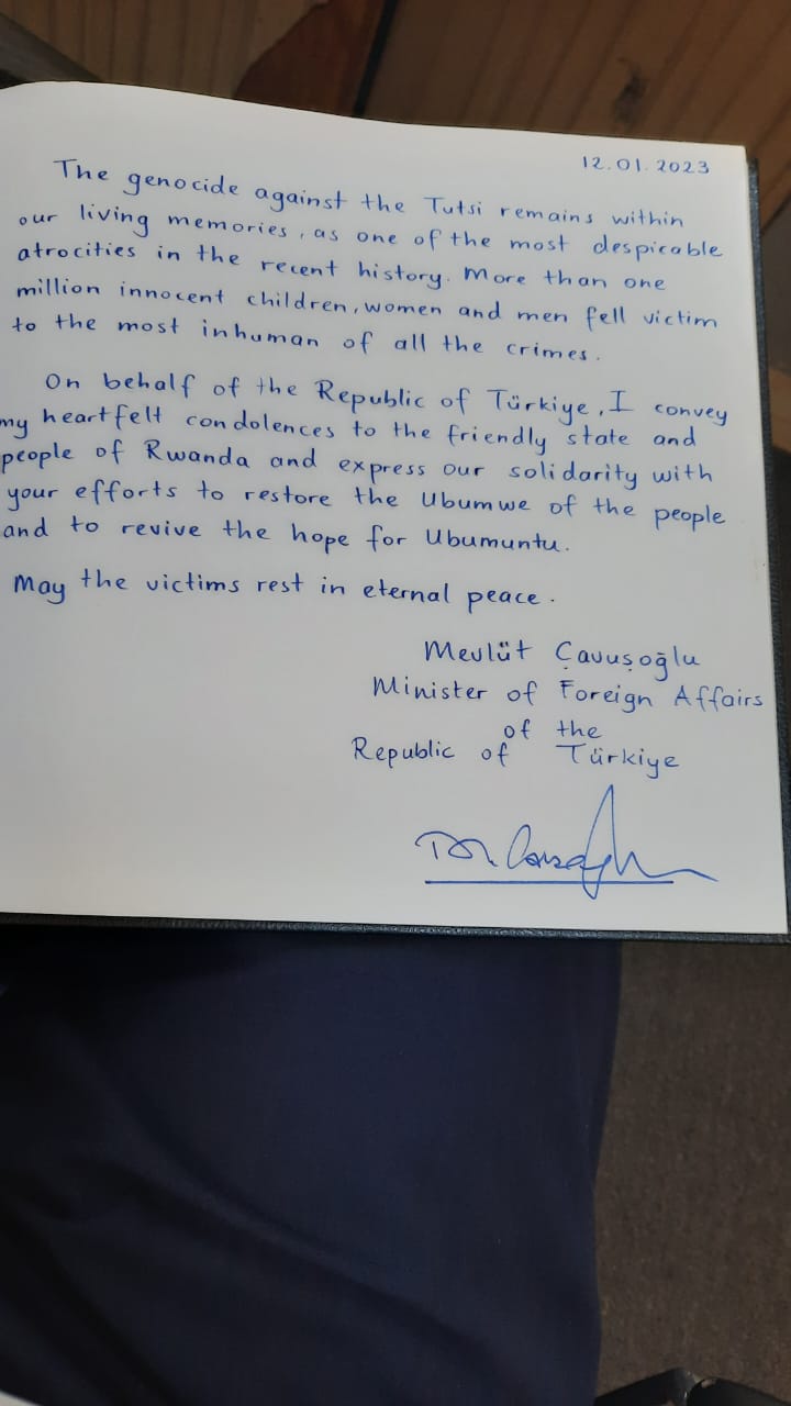 Mu gitabo cy’abashyitsi basuye Urwibutso rwa Jenoside yakorewe Abatutsi, Mevlüt Çavuşoğlu ushinzwe ububanyi n’amahanga wa Turikiya yanditse ko igihugu cye kifatanyije n’u Rwanda mu bihe rwanyuzemo.