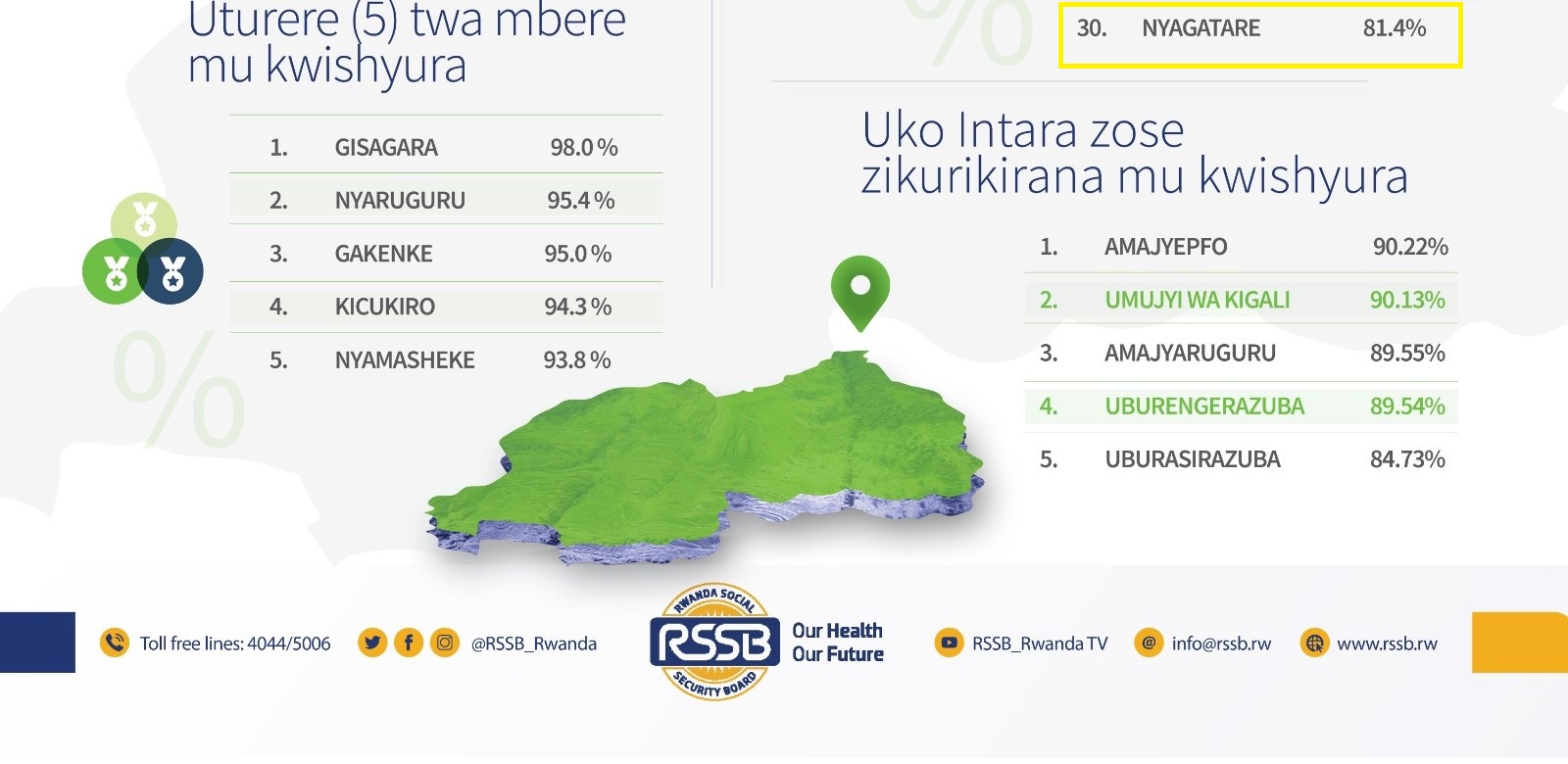 Ikigo cy’igihugu cy’ubwiteganyirize, RSSB, cyatangaje uko uturere tw’u Rwanda twatabiriye gutanga ubwisungane mu buzima, Mutuelle de Santé.