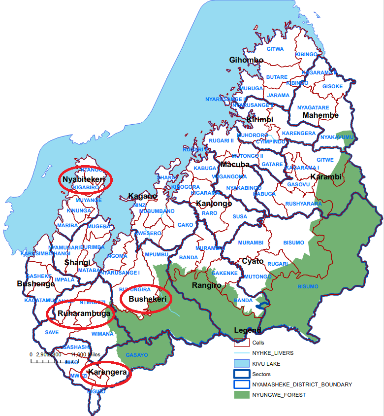 Ikarita y’imiterere y’Akarere ka Nyamasheke yerekana ko uretse Umurenge wa Nyabitekeri, indi mirenge itatu isigaye yose ikoranaho.