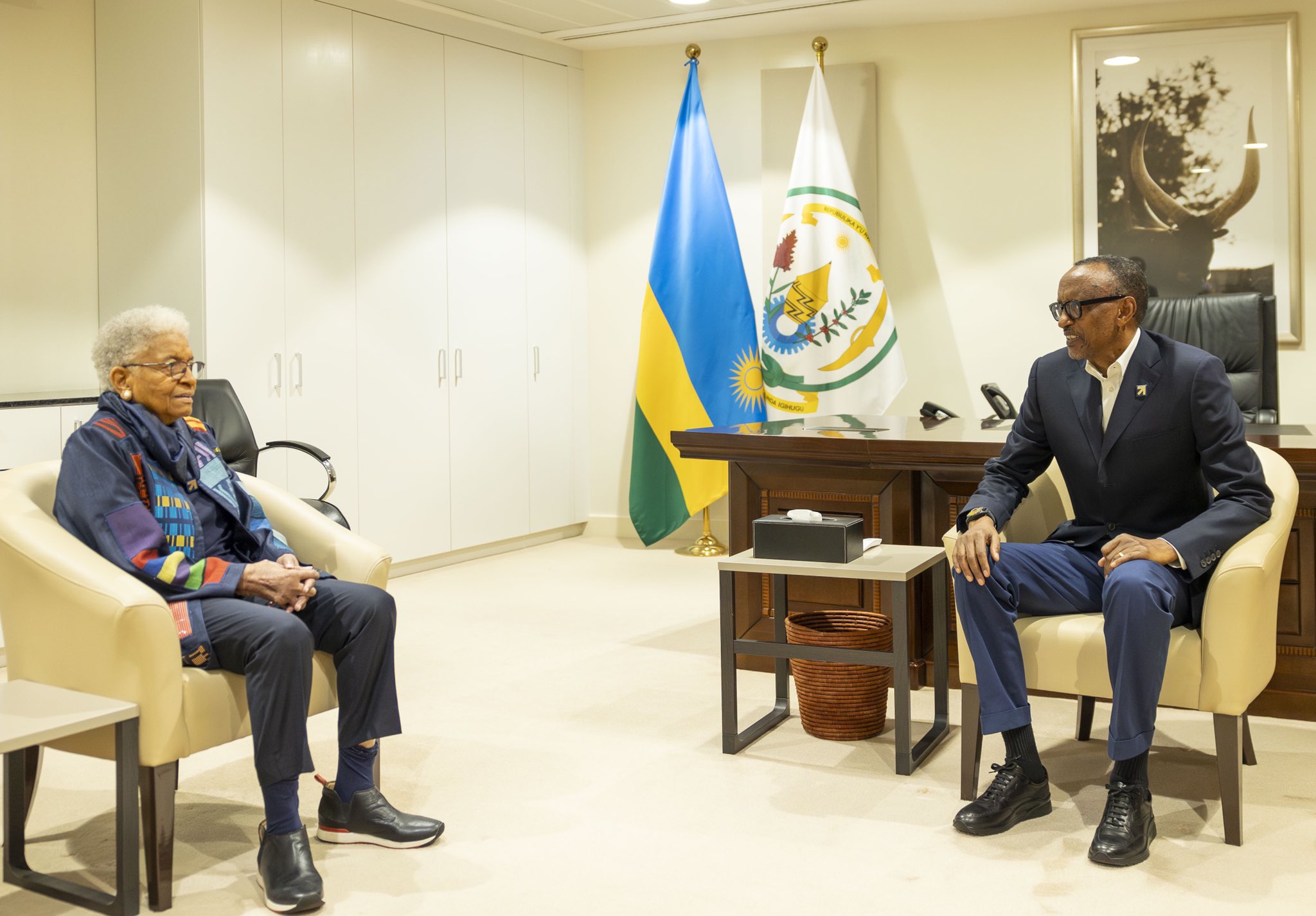 Perezida Paul Kagame yaraye yakiriye mu Biro bye Ellen Johnston Sirleaf wigeze kuyobora Liberia ndetse na Graça Machel umufasha wa Samora Machel wategetse Mozambique ndetse aba n’uwa Nelson Mandela wategetse Afurika y’Epfo.