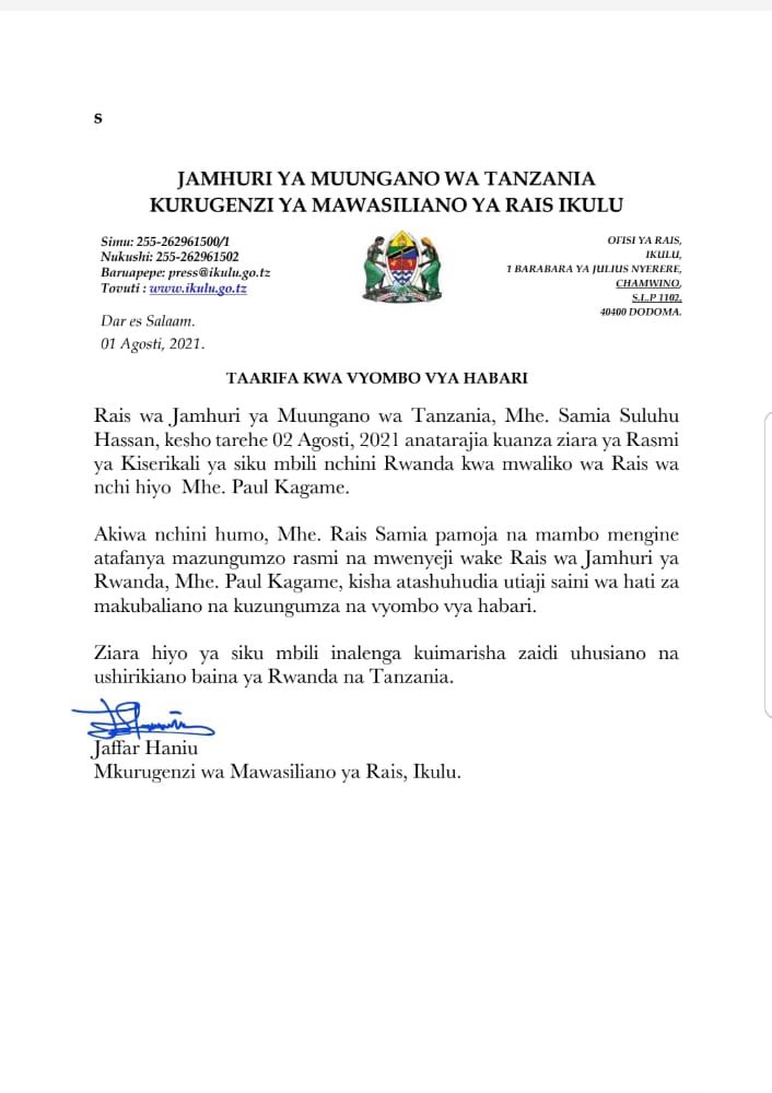 Mu itangazo ryasohowe n’Umuyobozi ushinzwe itumanaho rya perezida wa Tanzania, Jaffar Haniu, byatangajwe ko ejo ku ya 2 Kanama 2021 Perezida Suluhu azatangira uruzinduko rw’iminsi ibiri mu Rwanda, ku butumire bwa Perezida Paul Kagame.
