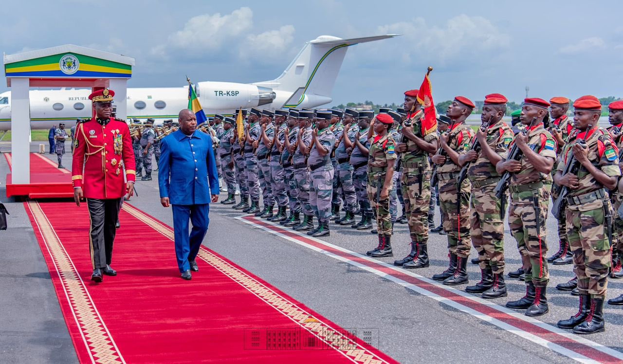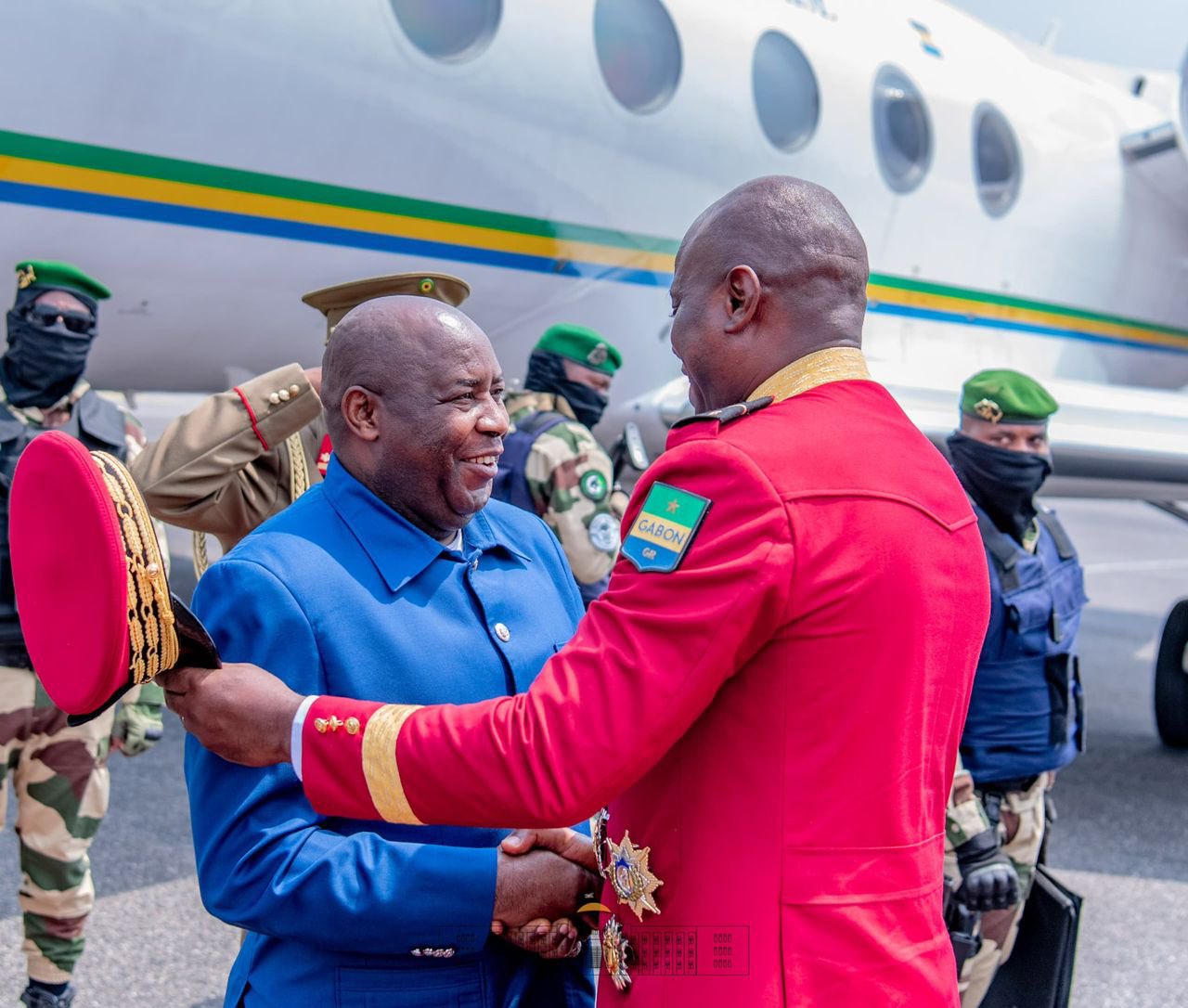 Ku kibuga mpuzamahanga cy’indege i Libreville, Perezida Ndayishimiye yaje kwakirwa na mugenzi uyobora Gabon by’inzibacyuho witwa Gen Brice Oligui Nguema.
