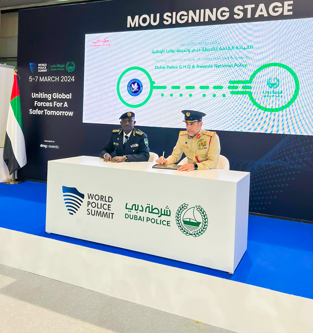 Yashyizweho umukono n’Umuyobozi Mukuru wa Polisi y’u Rwanda (IGP) CG Felix Namuhoranye n’Umuyobozi wa Polisi ya Dubai Lt. Gen. Abdullah Khalifa Al Marri mu gikorwa cyakozwe kuri uyu wa Kane taliki ya 7, Werurwe, 2024 i Dubai muri Leta Zunze Ubumwe z’Abarabu (UAE).