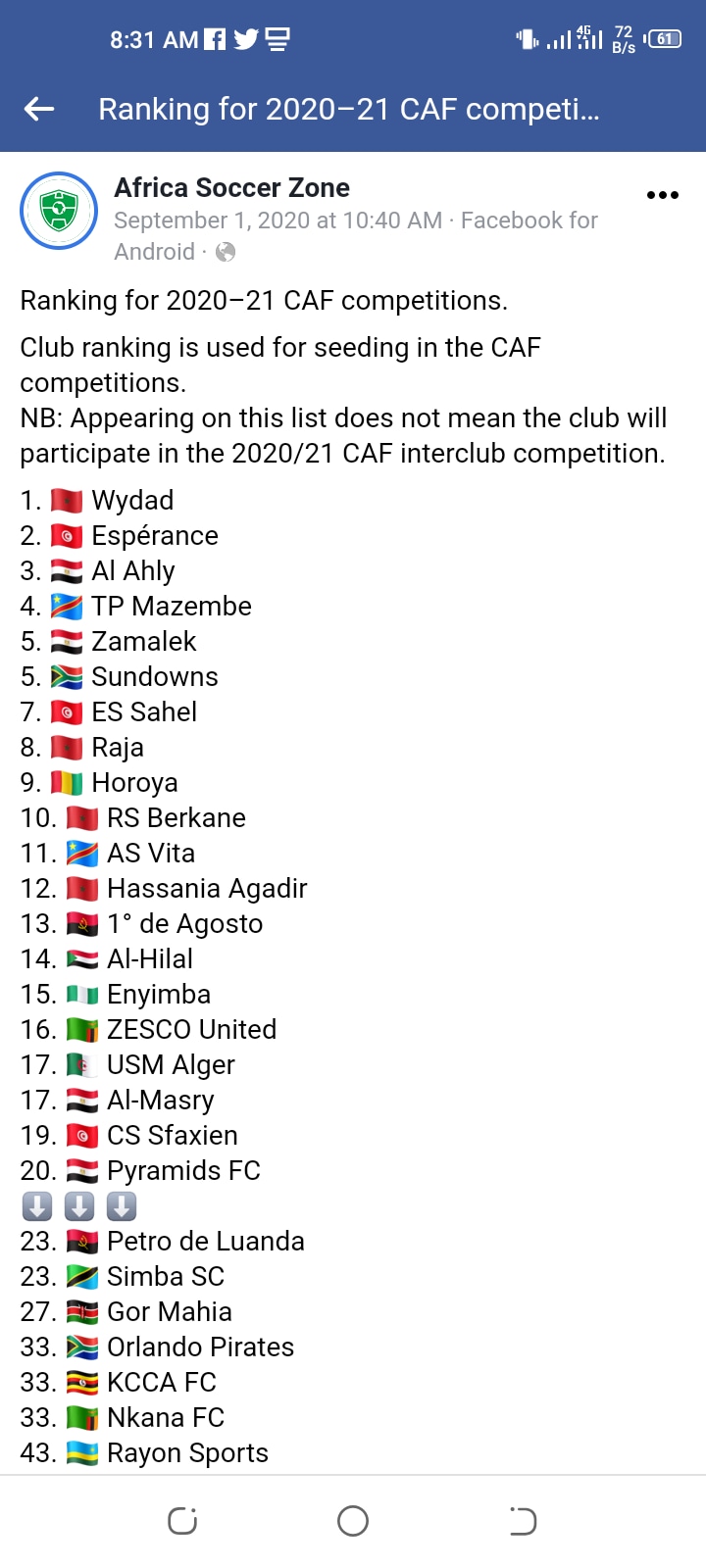 Kuri uru kuri uru rutonde Rayon Sport iri ku mwanya wa 43, n’aho mu makipe yo mu Karere u Rwanda ruherereyemo harimo na Simba Sports Club yo muri Tanzania iri ku mwanya wa 17, ndetse na Gor Mahia yo muri Kenya iri ku mwanya wa 29.