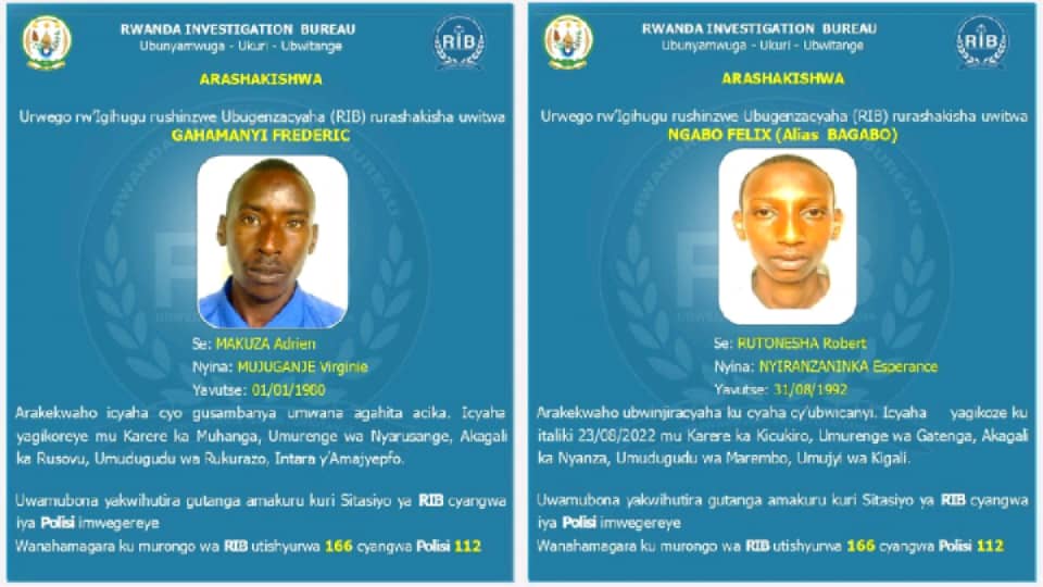 Urwego rw’Igihugu rw’Ubugenzacyaha, RIB, rurasaba Abanyarwanda n’undi wese wabona abantu babiri yasohoye amafoto yabo ko yabiyimenyesha cyangwa akabimenyesha urwego rw’umutekano urwo ari rwo rwose bagafatwa bakagezwa imbere y’ubutabera.