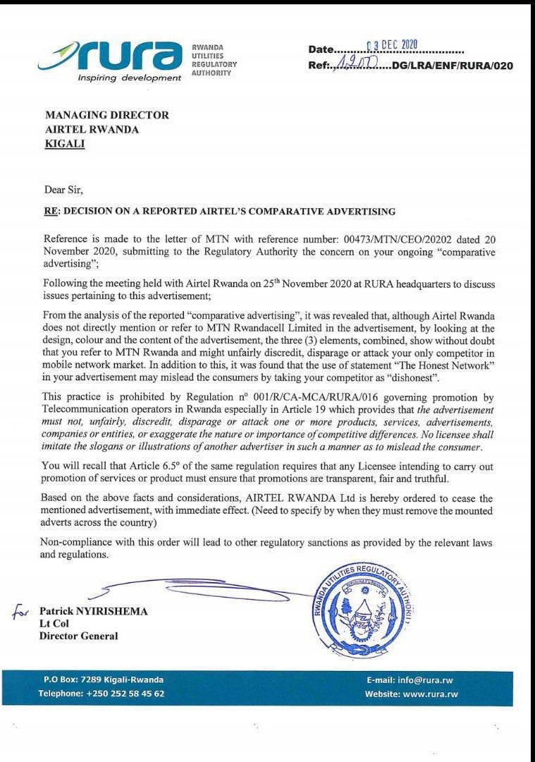 Ibaruwa yanditswe n’ubuyobozi bwa RURA bukiyoborwa na Lt Col Patrick Nyirishema ifite Ref, 1200 DG/LRA/ENF/RURA/020 yo ku itariki 03, Ukuboza, 2020 isaba Airtel gukuraho itangazo ryayo ryamamaza ibyo ikora, kuko ngo risiga icyaha MTN bahanganye ku isoko.
