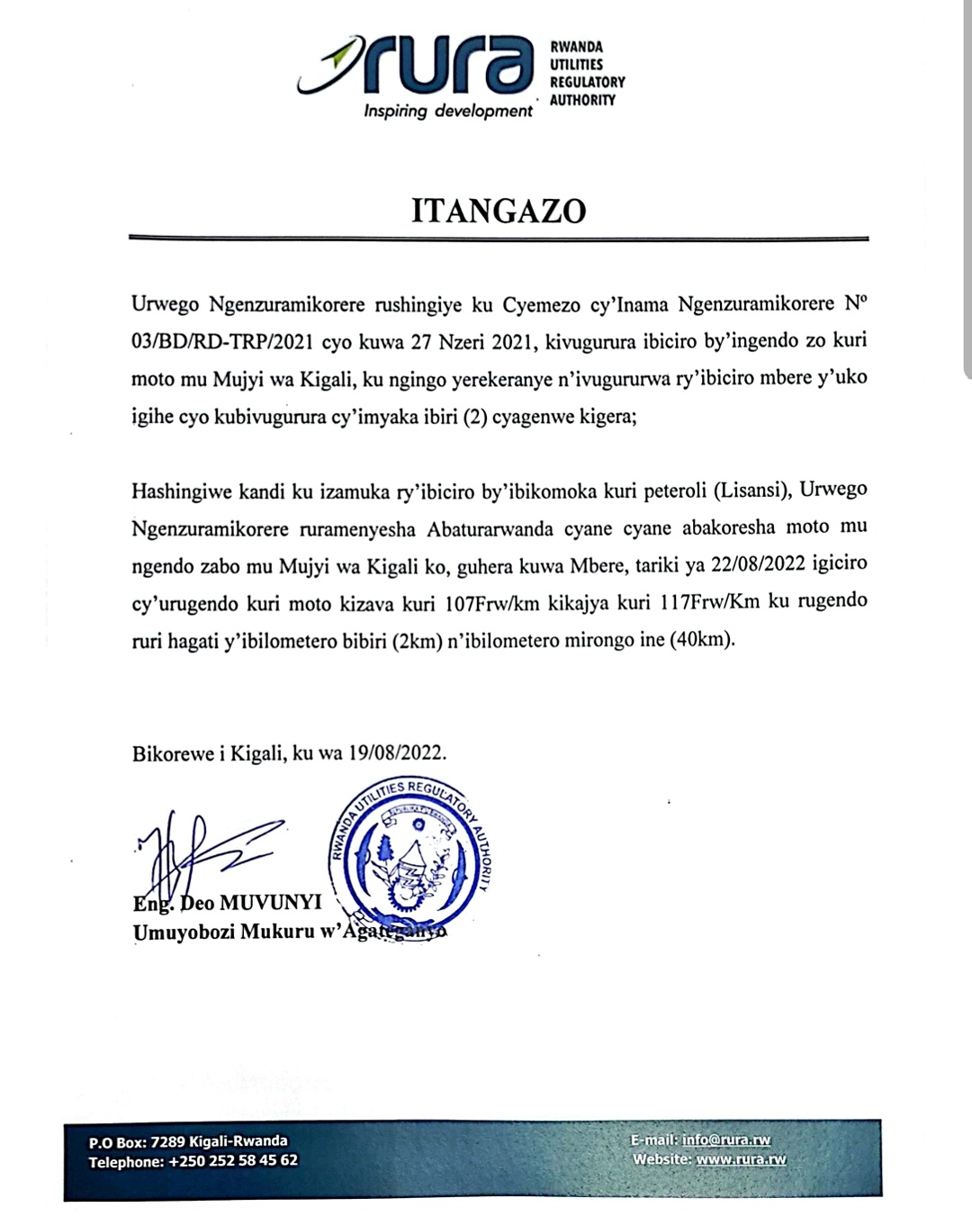 RURA yatangaje ko guhera ku wa Mbere w’Icyumweru gitaha( Taliki 22, Kanama, 2022), umugenzi azajya yishyura umumotari Frw 117 kuri kilometero imwe bivuye ku FrW 107 yishyuraga muri iki gihe.