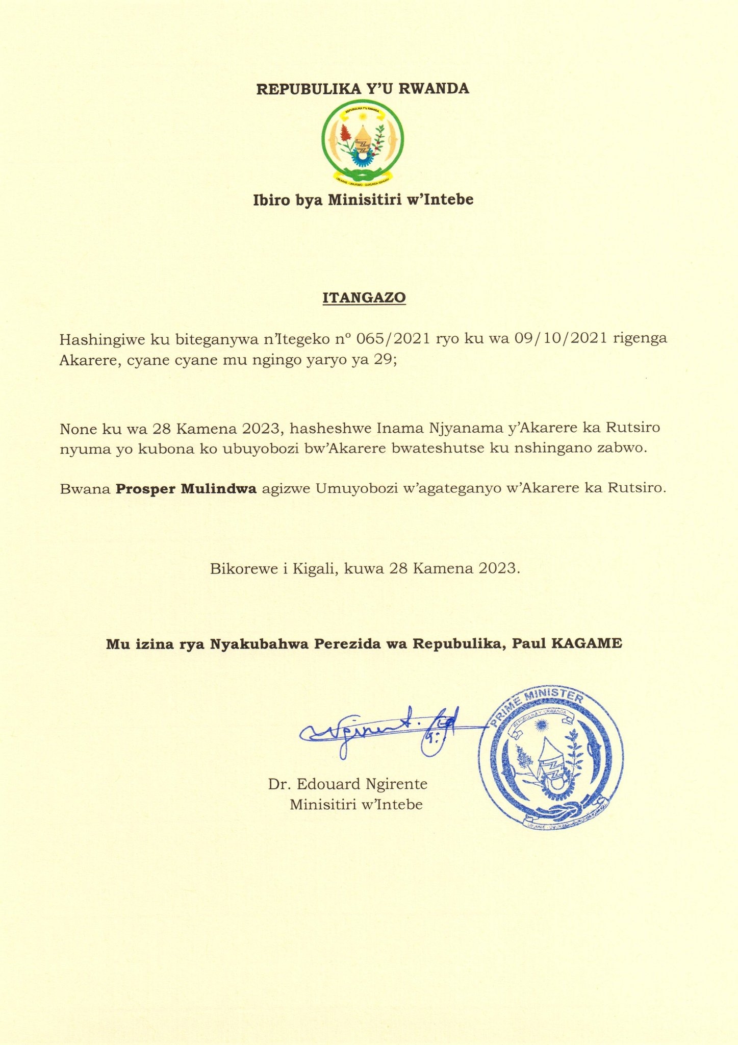 Ibiro Bya Minisitiri w’Intebe w’u Rwanda byasohoye itangazo ry’uko Prosper Mulindwa yagizwe Umuyobozi w’Akarere ka Rutsiro nyuma y’uko Inama nyobozi y’aka Karere iseshwe.