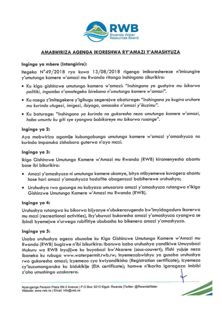 Rimwe muri ayo mabwiriza rivuga ko uzajya ahabwa uruhushya rwo gucunga aya mazi no kuyabyaza umusaruro ‘agomba kuzitira icyanya agenzura’.