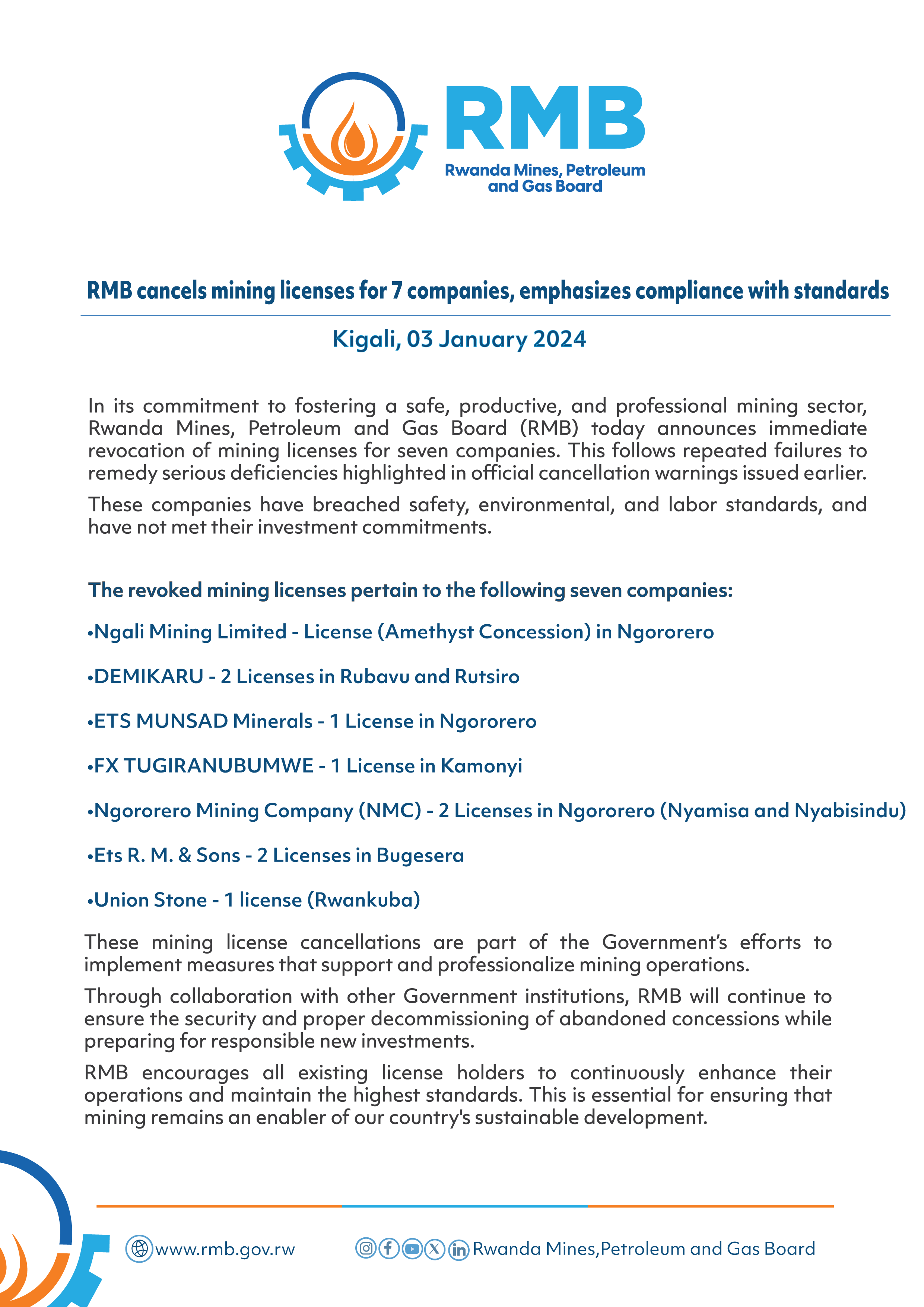Itangazo ry’iki kigo rivuga ko biriya bigo byari byaraganirijwe kenshi ngo bikosore uko bicukura ariko ntibyakurikiza ayo mabwiriza.