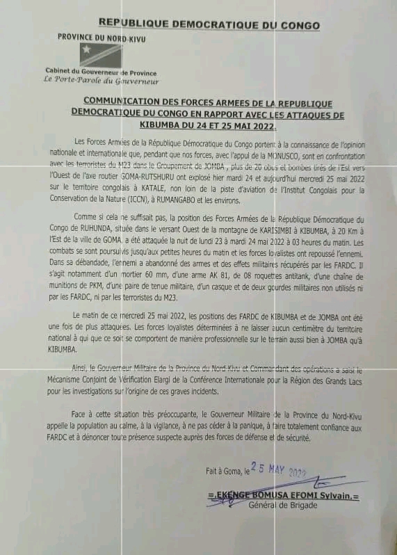 Ni itangazo ryashyizweho umukono n’Umuvugizi wa Guverineri w’Intara ya Kivu y’Amajyaruguru witwa Brig Gen Ekenge Bomisa Efomi Sylvain.