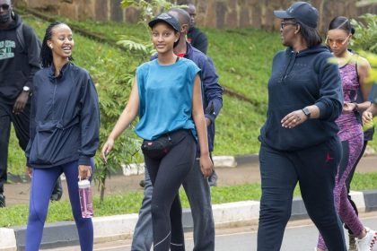 Miss Divine Nshuti Muheto, Miss Naomie Nishimwe na Miss Jolly Mutesi bari mu bifatanyije na Madamu Jeannette Kagame muri siporo rusange yabaye kuri iyi taliki ya 01, Gicurasi, 2022 ku munsi wo ku Cyum...