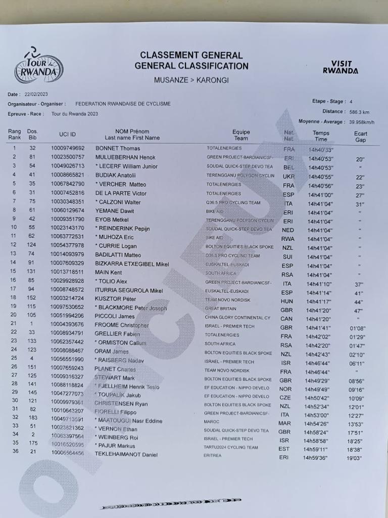 Umufaransa Thomas Bonnet ukinira ikipe ya Total Energies niwe umaze kwegukana agace ka Musanze-Karongi kareshya na Kilometero 138,3.
