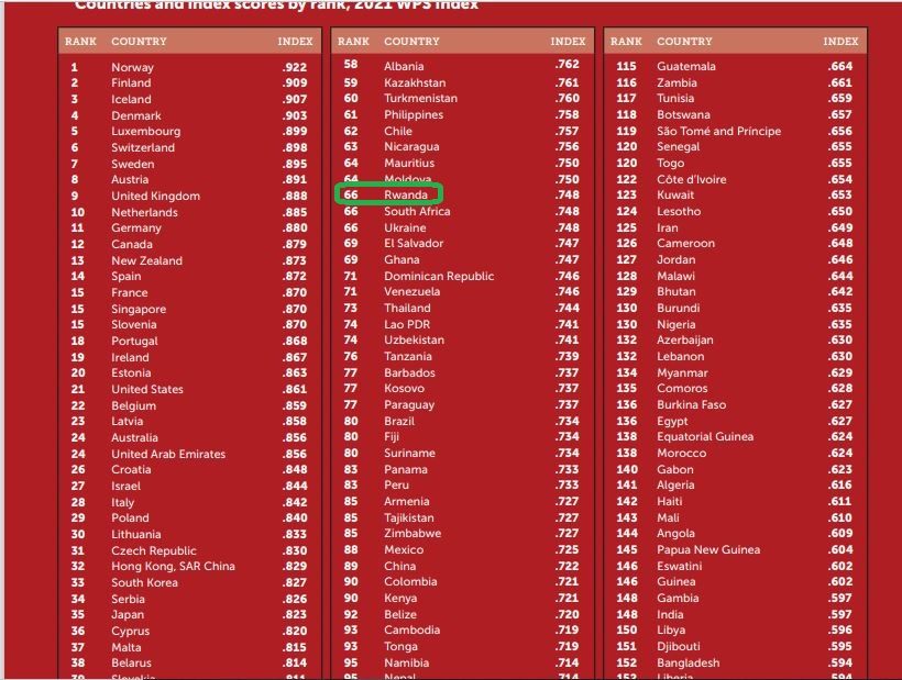 Raporo yiswe Women Peace and Security Index itangaza ko u Rwanda ari igihugu cya 66 ku isi aho abagore baguwe neza, rukaba urwa kabiri muri Afurika mu guha abagore amahoro n’umutekano.