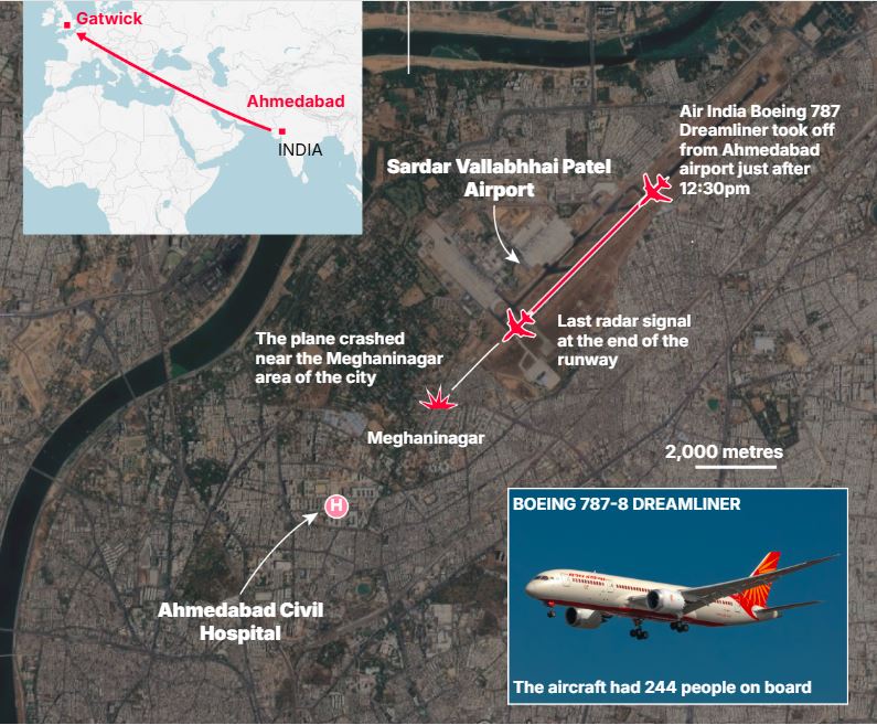 Indege yitwa Flight AI171 yari ihagarutse mu Buhinde yerekeje mu Bwongereza yahiye igihaguruka. Yari irimo abantu 242.