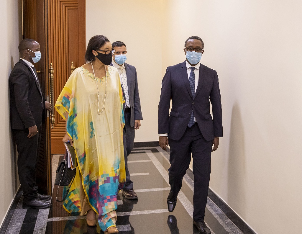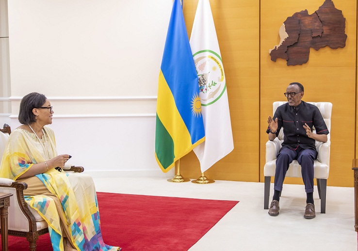 Umunyamabanga mukuru muri Commonwealth Madamu Patricia Scotland ubwo yajyaga guhura na Perezida Kagame