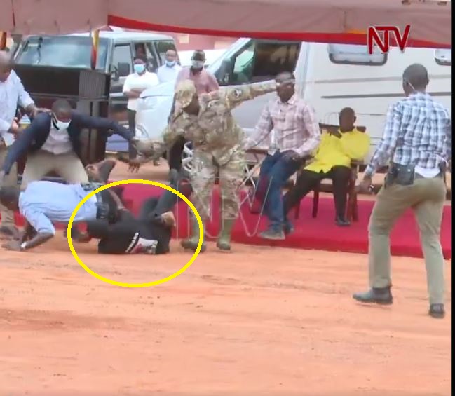 Icyo gihe hari amashusho yagaragaye umugabo yiruka agana aho Perezida Museveni yari yicaye aganira n’abaturage ashaka kumuhutaza, ariko abashinzwe umutekano w’Umukuru w’igihugu bamutanga imbere.