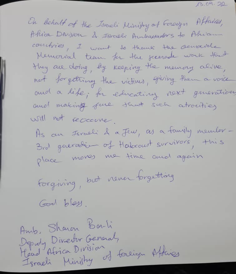 Uyobora Ishami rishinzwe Afurika muri Minisiteri y’ububanyi n’amahanga ya Israel  witwa Sharon Bar-Li yanditse mu gitabo cy’abasura urwibutso rwa Jenoside rwa Kigali ruri ku Gisozi ko kubabarira ari ngombwa ariko ko kwibagirwa ari ikosa.