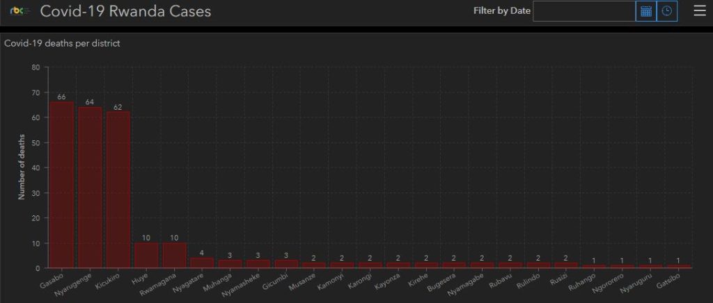 Urebye umubare w’abamaze gupfa bazize COVID-19 uko ari 249, usanga Kigali iri imbere kuko ifitemo abantu 192 (77.1%). Barimo 66 bo mu Karere ka Gasabo, 64 bo muri Nyarugenge na 62 bo muri Kicukiro.