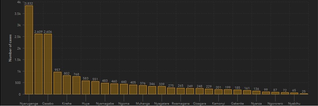 Hanze y’umurwa mukuru, uturere tumaze kugaragaramo abarwayi benshi kurusha utundi ni Rusizi (957), Kirehe (802), Rubavu (768), Huye (583), Musanze (551), Nyamagabe (483), Gicumbi (460), Ngoma (440), Gatsibo (405), Muhanga (376), Karongi (346), Nyagatare (339), Kayonza (275) na Rwamagana (265).