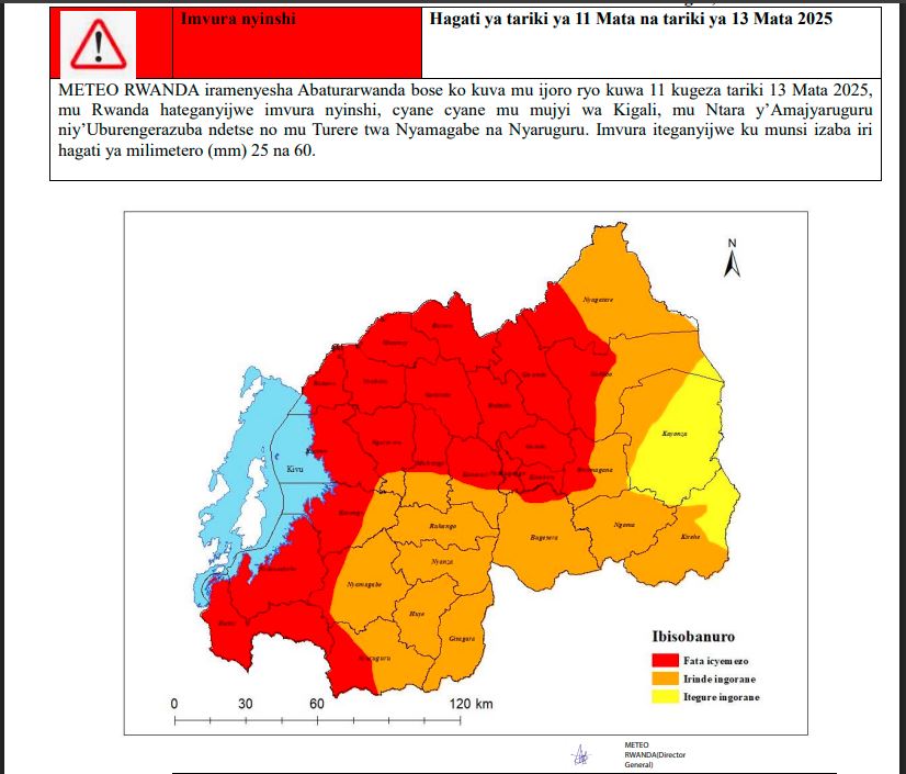 Meteo Rwanda iraburira abaturarwanda ko guhera kuri uyu wa Gatanu kuzageza kuwa Mbere tariki 14, Mata, 2025 mu Rwanda hateganyijwe imvura nyinshi izaba irimo n’inkuba.