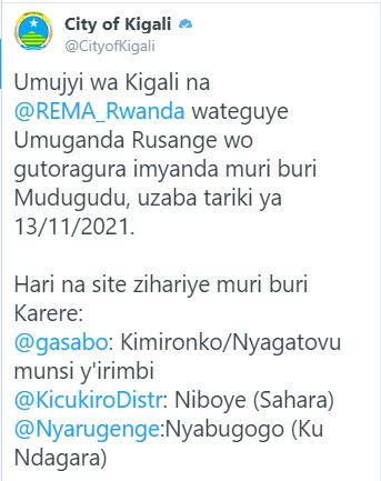 Ubuyobozi bw’Umujyi wa Kigali bwatangaje ko kuri uyu wa Gatandatu tariki 13, Ugushyingo, 2021 mu midugudu yose hateganyijwe Umuganda Rusange. Gusa ngo hari site zihariye zizakorerwamo umuganda ku rwego rwa buri Karere muri dutatu tugize uyu Mujyi.