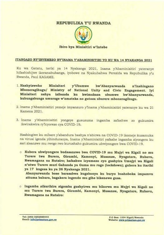 Kubera ubwiyongere budasanzwe bwa COVID-19 mu Mujyi wa Kigali no mu Turere twa Burera, Gicumbi, Kamonyi, Musanze, Nyagatare, Rubavu, Rwamagana na Rutsiro, inama y’abaminisitiri yafashe icyemezo cyo gushyira Umujyi wa Kigali n’uwo turere muri Gahunda ya Guma mu rugo, guhera ku itariki ya 17 kugeza ku ya 26 Nyakanga 2021.