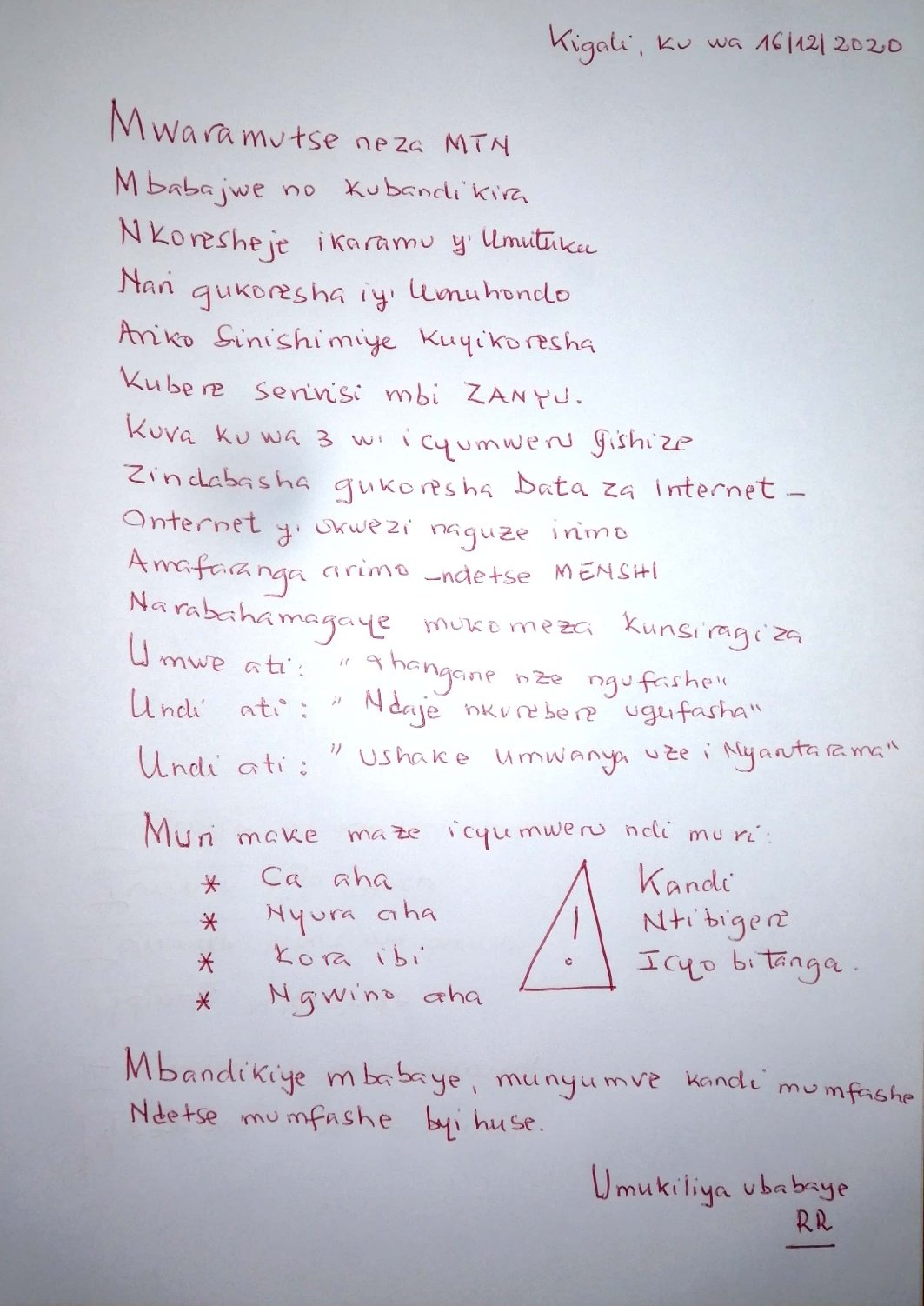 Umunyarwanda witwa Rugasaguhunga Ruzindana yandikiye ibaruwa Ikigo gicuruza Serivisi z’itumanaho na murandasi, MTN, ayicisha kuri Twitter akinenga ko amaze Icyumweru adashobora gukoresha murandasi yaguze imuhenze, yabaza ababishinzwe bakamusiragiza.