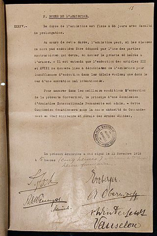 Taliki 11, Ugushyingo, 1918 nibwo impande zari zihanganye ku rugamba zicaye  ahitwa Le Francport hafi y’ahitwa Compiègne basinya amasezerano yo guhagarika intambara,  imirwano haba ku butaka, mu kirere no muzi igahagarara.