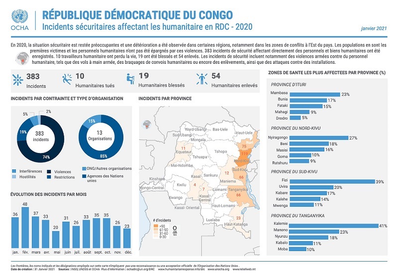 Imibare yasohowe n’Ibiro by’Umuryango w’Abibumbye bishinzwe guhuza ibikorwa by’ubutabazi n’abagira neza hirya no hino ku isi byatangaje ko abagiraneza 10 biciwe muri DRC umwaka ushize, 19 barakomereka, abandi 54 barashimutwa.