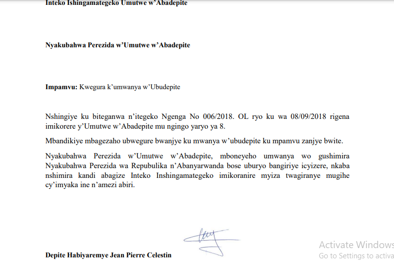 Depite Habiyaremye Jean Pierre Celestin yabwiye Taarifa ko yeguye , ndetse ko ibaruwa w’ubwegure bwe yayigejeje ku buyobozi bw’Inteko ishinga amategeko ariko ko atarasubizwa.