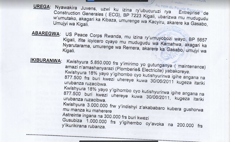 Rwiyemezamirimo witwa Juvens Nyawakira avuga ko Umuryango w’Abanyamerika witwa US Peace Corps wamuhaye akazi ko kuzajya asana ibikoresho by’aho ukorera ukamwishyura. Wamwishyuye igihe gito, nyuma urabihagarika, akavuga ko wamwambuye Frw 18.250.000.
