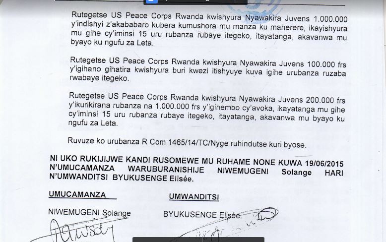 Nyawakira yareze PEACE CORPS mu Rukiko Rukuru rw’Ubucuruzi arayitsinda nk’uko byemejwe mu rubanza rwasomwe tariki ya 19/06/2015.