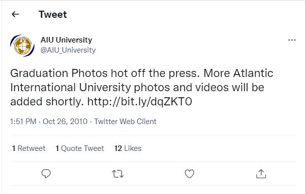 Tariki 26, Ukwakira, 2010, kuri Twitter y’abavuga ko bakora muri iriya Kaminuza hatambutse ubutumwa bwavugaga ko hari abanyeshuri bayo barangije amasomo, ko ibyishimiye kandi ko bidatinze iri bushyire amafoto yabo kuri Twitter ariko iyo ufunguye link bavuga ko bari bashyizeho ayo mafoto ntayo ubona.